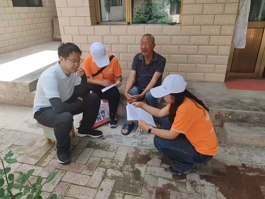 中午 12:00—13:30 农户访谈与宣传在当地农户家的小院里,指导老师带领任新洁,骆琦向村民发放《耕地保护与复耕政策手册》,用通俗语言讲解撂荒耕地的危害及遥感监测对精准施策的作用。同时向住户询问家里耕地的种植情况以及产量收入情况。