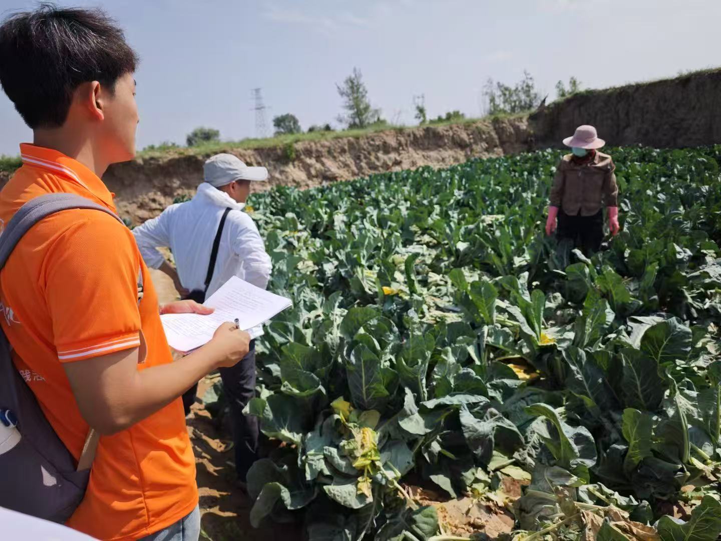 ”图为实践成员马明辉在菜地旁记录访谈内容。骆琦 供图。