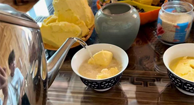 普通话为大叔带来了更多机会,和政府和企业的更多沟通,让大叔也意识到了推广普通话的意义所在。因此,大叔对我们的工作表示了非常的支持,并且非常热情的让我们体验当地独特的酥油糌粑。大叔的热情容不得我们的拒绝,为我们现场带来了制作教学。每个人一个大碗,三大块酥油(我们称之为黄油),撒点芝士,热水冲开,浓郁的奶香味跑满了房间,再撒些白糖,准备工作已然就绪。下一步就是加入糌粑,就像我们和面一样,在周挂大叔的手下,酥油糌粑逐渐成型,怕我们吃不习惯还加了很多很多蜂蜜。殊不知,这份心意比蜂蜜更能为我们带来香甜的感觉。