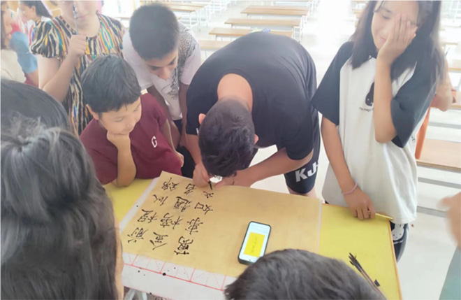 课程结束后,人文学院服装与服饰设计2023级2班金永辉同学向当地学生展示瘦金体,深受当地学生的喜欢,同学们争先恐后地让金永辉同学为他们书写自己的名字。同学们也主动拿起毛笔进行练习、创作。“