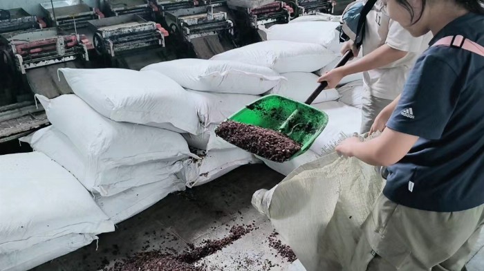 图为小队成员将加工后的山茱萸装入袋中。实践队成员秦嘉瑶摄