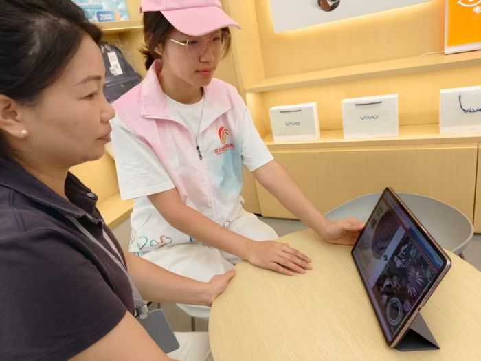 8月27日,志愿队首先在宝应县吾悦广场vivo线下门店开展文化宣传活动。志愿者们身着统一服装,借助门店平板设备展示侗族特色图案,包括侗族刺绣纹样、鼓楼建筑轮廓等文化符号,向顾客详细讲解图案背后的文化寓意。例如,侗族刺绣中的花鸟图案象征着对自然的敬畏,几何图形则代表着民族的历史记忆。此外,志愿者还通过文字资料补充介绍了侗族的传统节日,如萨玛节的祭祀流程、合拢宴的热闹场景,以及侗族大歌的多声部合唱特色,引导顾客从多角度深入了解侗族文化。