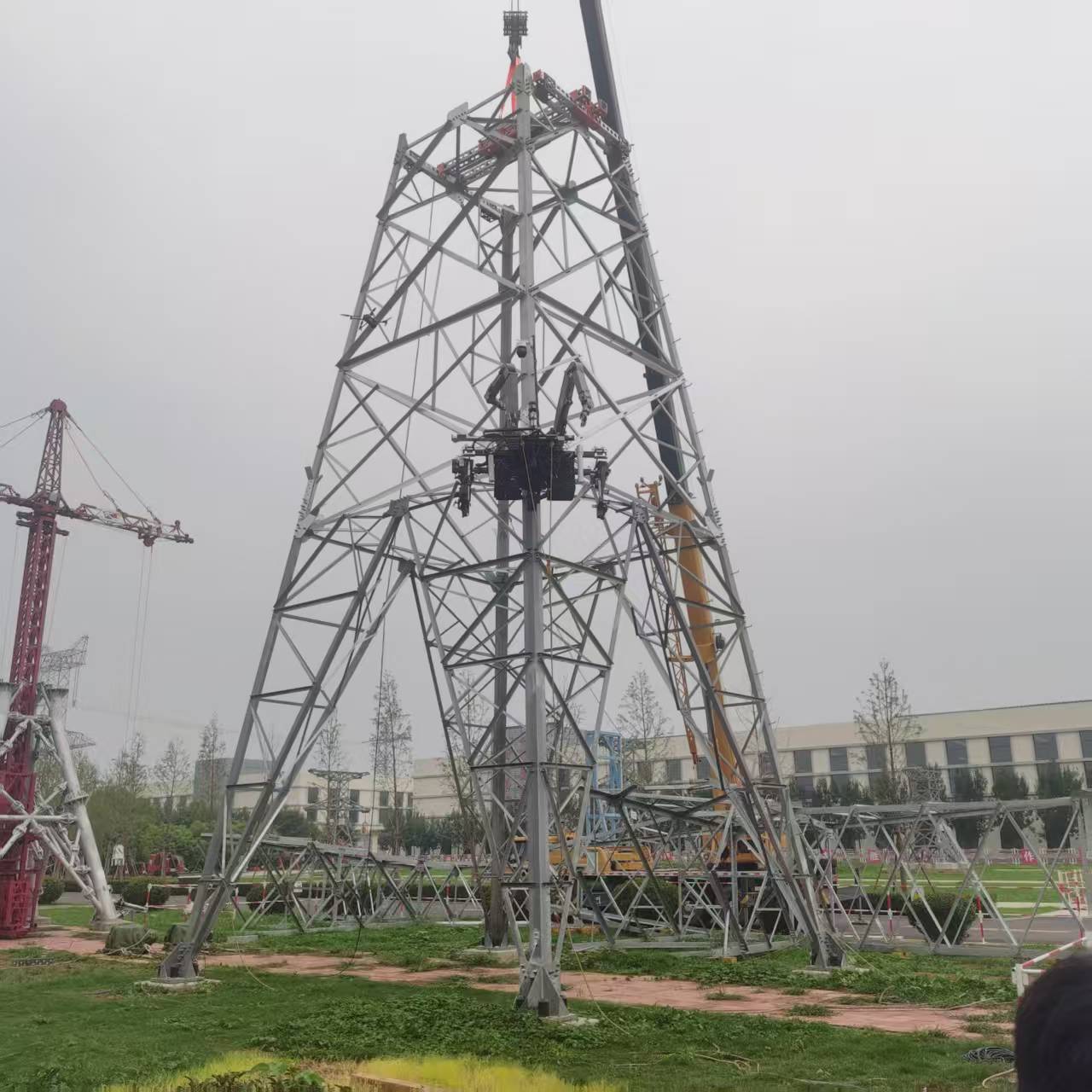 随后,青锋研行队来到山东电网电力工匠学院,围绕国网山东省电力公司科技项目“输电铁塔组立高处作业机械化施工关键技术及装备研制应用”深入学习。在模拟实训场地,队员们现场观摩了项目研发的智能抱杆、自动螺栓紧固设备的实操演示:装备通过伸缩臂调整、夹持机构固定,精准完成铁塔构件的起吊与对位,全程无需人工高空作业。“传统人工组立铁塔,不仅效率低,还存在坠落风险,这个项目的装备正好解决了行业痛点。”国家电网技术人员的讲解让队员们快速把握项目核心价值。队员们还就装备的机械结构设计、远程操控原理与技术人员交流,了解装备在复杂地形、强风环境下的适应性改进,记录下装备研发“从现场需求出发”的关键思路,为后续接触电力机械相关项目积累了实践认知。