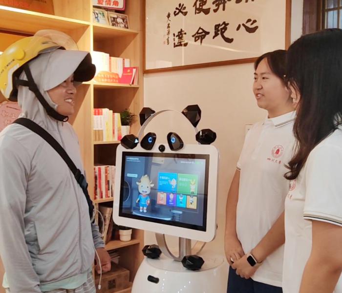 “小牛哥・刹一脚”爱心智慧驿站自2021年在成都市委组织部指导下建立,2022年投入使用,是新就业群体24小时不打烊的“暖心服务站”和“温馨港湾”。目前,四川省成都市锦江区已建成41个此类驿站,为外卖员、快递员等提供19项贴心服务。实践团成员实地参观了“小牛哥・刹一脚——宏清站”,这里不仅设有“爱心冰柜”——在夏季为户外工作者提供冰镇饮用水,咖啡机、饮水机、冰箱、空调、微波炉等设备一应俱全,还有常用药品、应急雨衣等暖心物资;而且,驿站还引入智能机器人,为“小牛哥”提供法律援助、政策咨询等服务,科技管家实现全天候值守,让新就业群体随时可享服务。