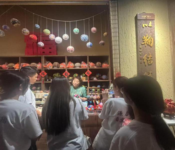 在临淄足球博物馆,实践队还见到了蹴鞠制作技艺传承人杜少霞。她现场演示了传统蹴鞠的制作过程,并详细讲解了鞠球从皮质选料、手工缝制到充气调试的全套工艺。杜少霞表示,尽管现代蹴鞠在生产工具和材料上有所创新,但核心技艺和匠心精神始终未变。“每一颗蹴鞠都承载着制作者的心血与文化理解,我们希望它在新时代依然能‘踢’出精彩。”她说道。队员们在访谈中深刻感受到非遗技艺背后所蕴含的耐心与智慧。