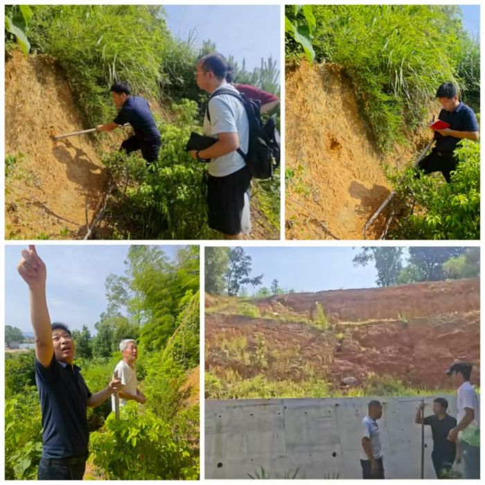 在李德营教授的带领下,团队聚焦具体地质灾害风险区开展了详细调查。上午,团队前往天城镇谢家坳村金阿姨家房屋切坡进行实地调查。李老师现场亲自指导成员们进行调查工作,大家认真地调查边坡形态、规模、坡度、斜坡结构、地层岩性、岩土体强度、边坡变形等情况,绘制了工程地质剖面图。同时,成员们还与村民亲切交流,详细询问房屋的建设时间、经历过的滑坡险情以及汛期边坡变形特征,为分析切坡建房地质灾害风险积累了宝贵的第一手数据。