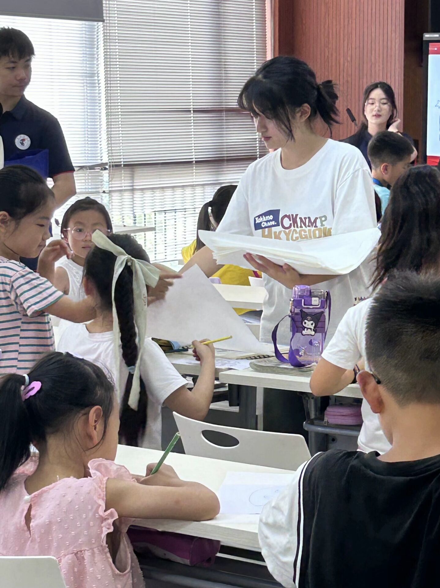 图为志愿者董秀兰向孩子们分发绘画材料 中国青年网通讯员 陈旭 供图