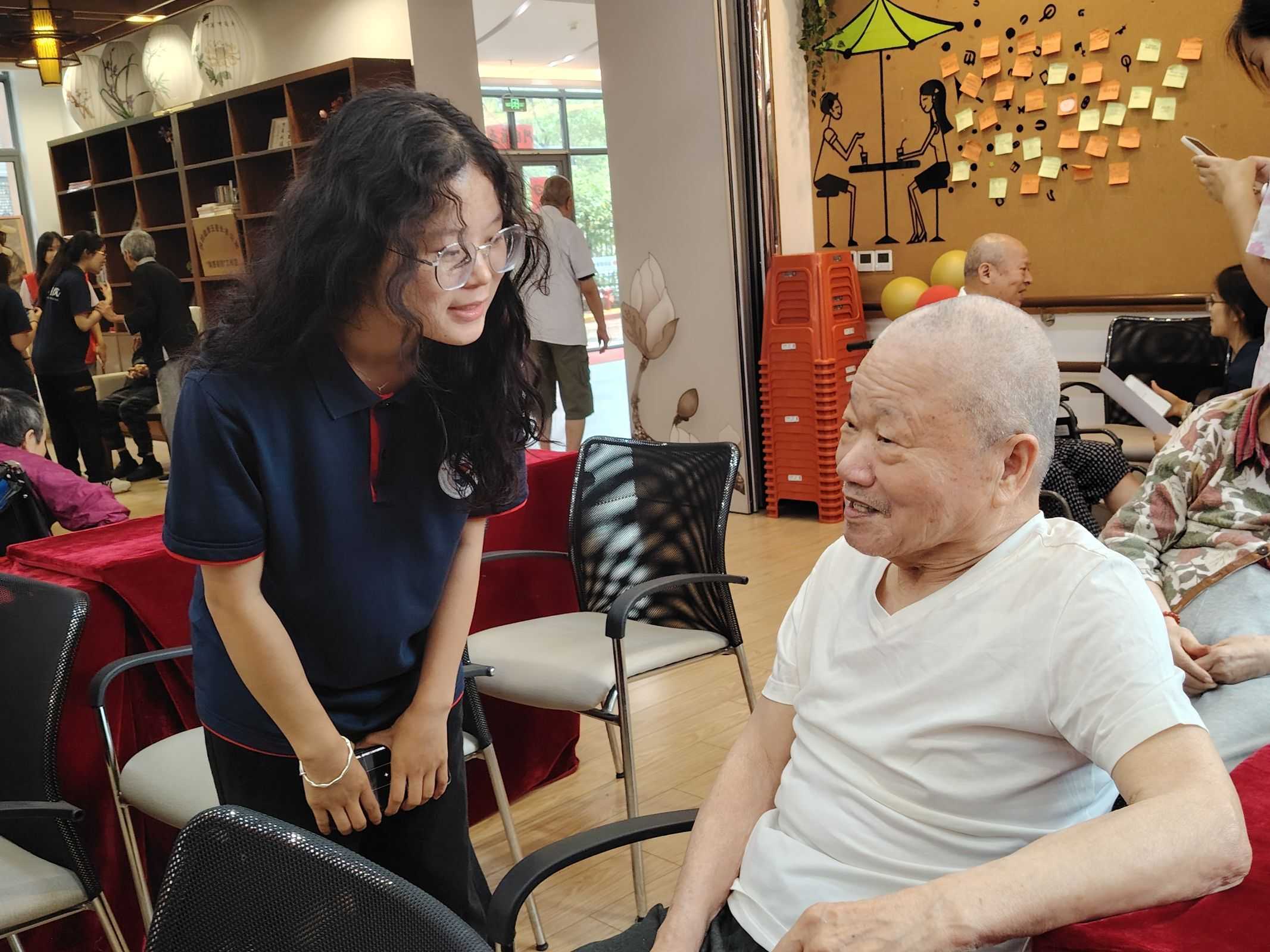 图为志愿者陈旭与一位爱好书法的长者交流中华文化的流传与创新发展 通讯员 董秀兰供图