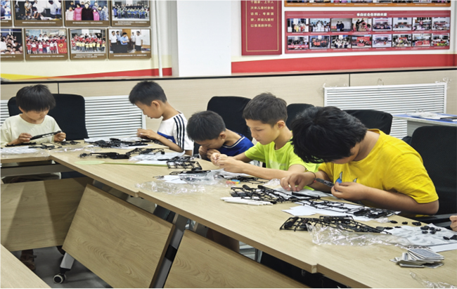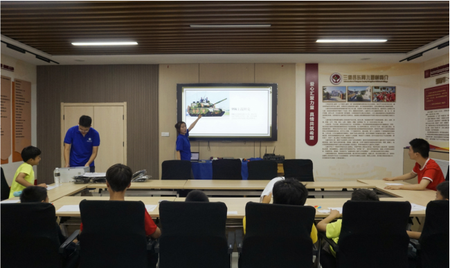 随后,实践队开展了一场生动的国防知识科普讲座。实践队员以视频方式向孩子们介绍了武器坦克等兵工知识,通过实物模型和图片展示,让孩子们更直观地了解兵器的构造和原理。孩子们聚精会神地聆听,用笔和纸设计出自己心中的武器装备;接着,队员详细讲解了枪械设计的基本原理和流程,让孩子们对枪械设计有了初步的认识,孩子们积极参与互动,展现出浓厚的兴趣。随后,在队员的指导下孩子们亲自动手拼装枪械模型,他们认真细致地组装每一个部件,最终完成了自己的作品。