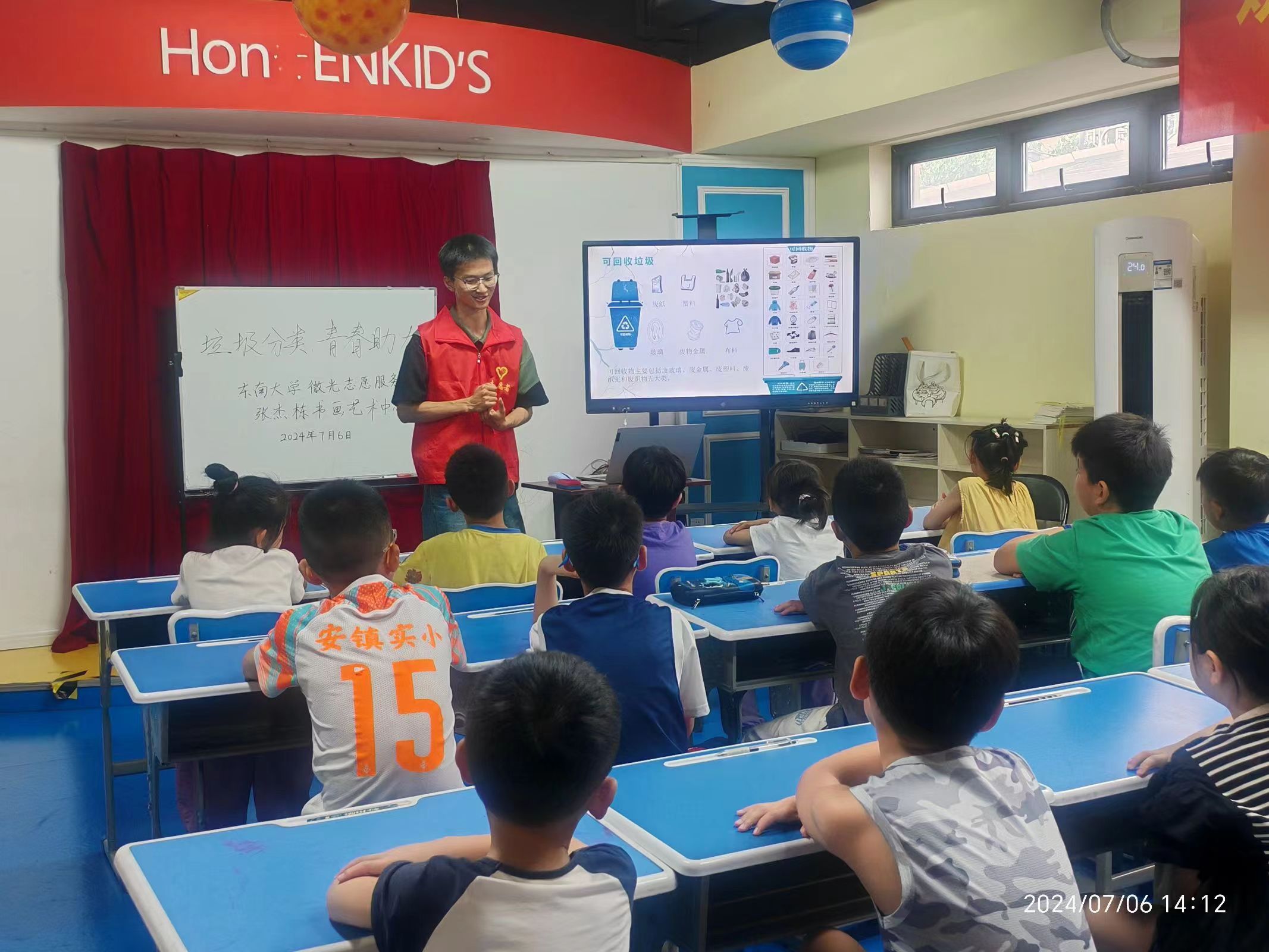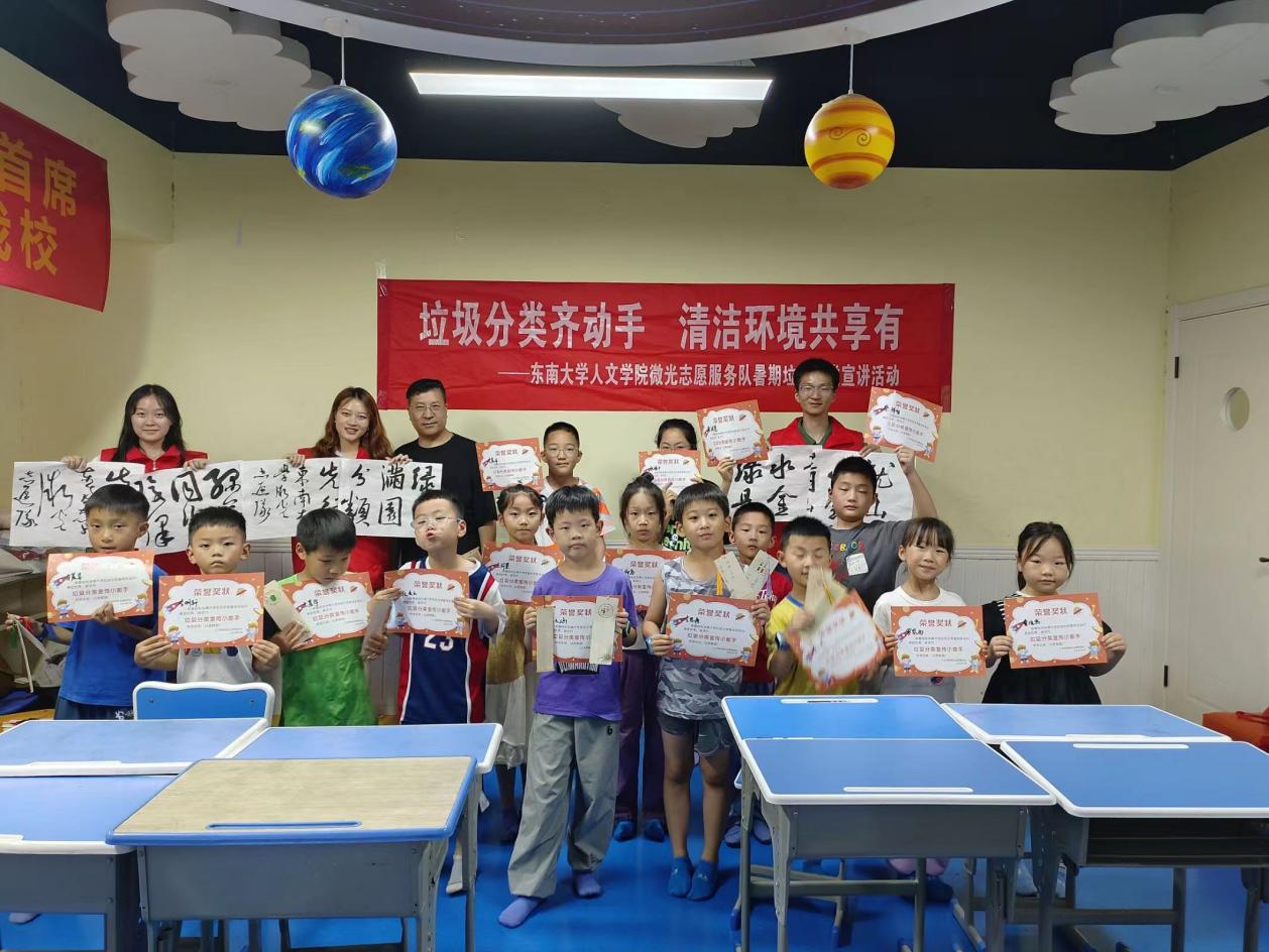 为学习贯彻习近平总书记生态文明思想,践行绿水青山就是金山银山的理念,响应垃圾分类号召,同时体会中国传统书法艺术之美,以书法墨香传递绿色理念。2024年7月6日下午,东南大学微光志愿服务队成员前往江苏省无锡市新吴区张杰栋书画艺术中心,在著名书法家张杰栋的帮助下,带领机构的小朋友学习垃圾分类基础知识、参加垃圾分类趣味游戏、开展环保主题书法创作,通过“理论+实践”和“艺术+趣味”的宣讲形式弘扬新时代环保理念。