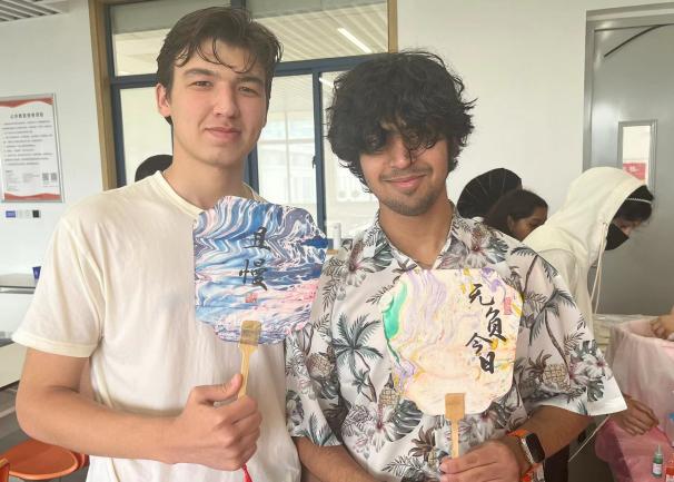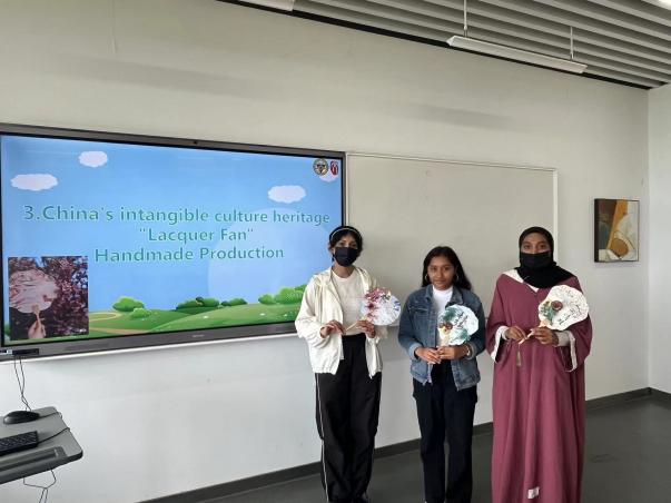 非遗“漆扇”手工制作环节是此次活动的亮点之一。留学生们认真聆听漆扇制作的讲解,亲手体验制作过程。他们运用各色植物、干花等可回收材料装点漆扇,每一把漆扇都独具匠心,展现了他们对中国传统文化的独特理解。通过亲身实践,留学生们不仅感受到了中国传统手工艺的魅力,也进一步践行了绿色低碳的环保理念。