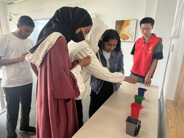 活动中,留学生们还与东南大学的同学们展开了热烈的垃圾分类理念交流。他们分享了自己国家在垃圾分类活动中的特色,并与中国的做法进行对比。通过这种跨文化互动交流,大家不仅拓宽了视野,也更加深刻地理解了“垃圾分类”和“低碳环保”等理念的重要性。