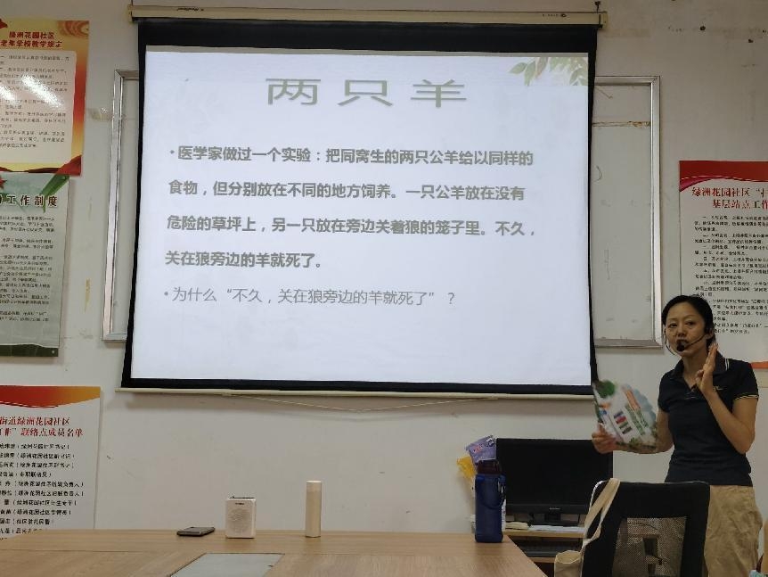 随后裴老师通过一张关于情绪的PPT向大家介绍了情绪的类型,为了让孩童更加透彻的理解多样的情绪,裴老师利用实例与理论相结合,利用身边经常发生的事情进行叙述。紧接着从定义、表现、影响等维度对消极情绪进行了重点分析,并指出消极情绪在“预警”及“对比”两方面的重要作用——它能够促使我们做出改变,也能让我们生活中美好的事情变得更鲜明。裴老师通过心理学上“两只羊”的情绪实验,一只羊在狼的注视下很快便因为恐惧而死亡,启发听众负面情绪对生物具有巨大的影响。