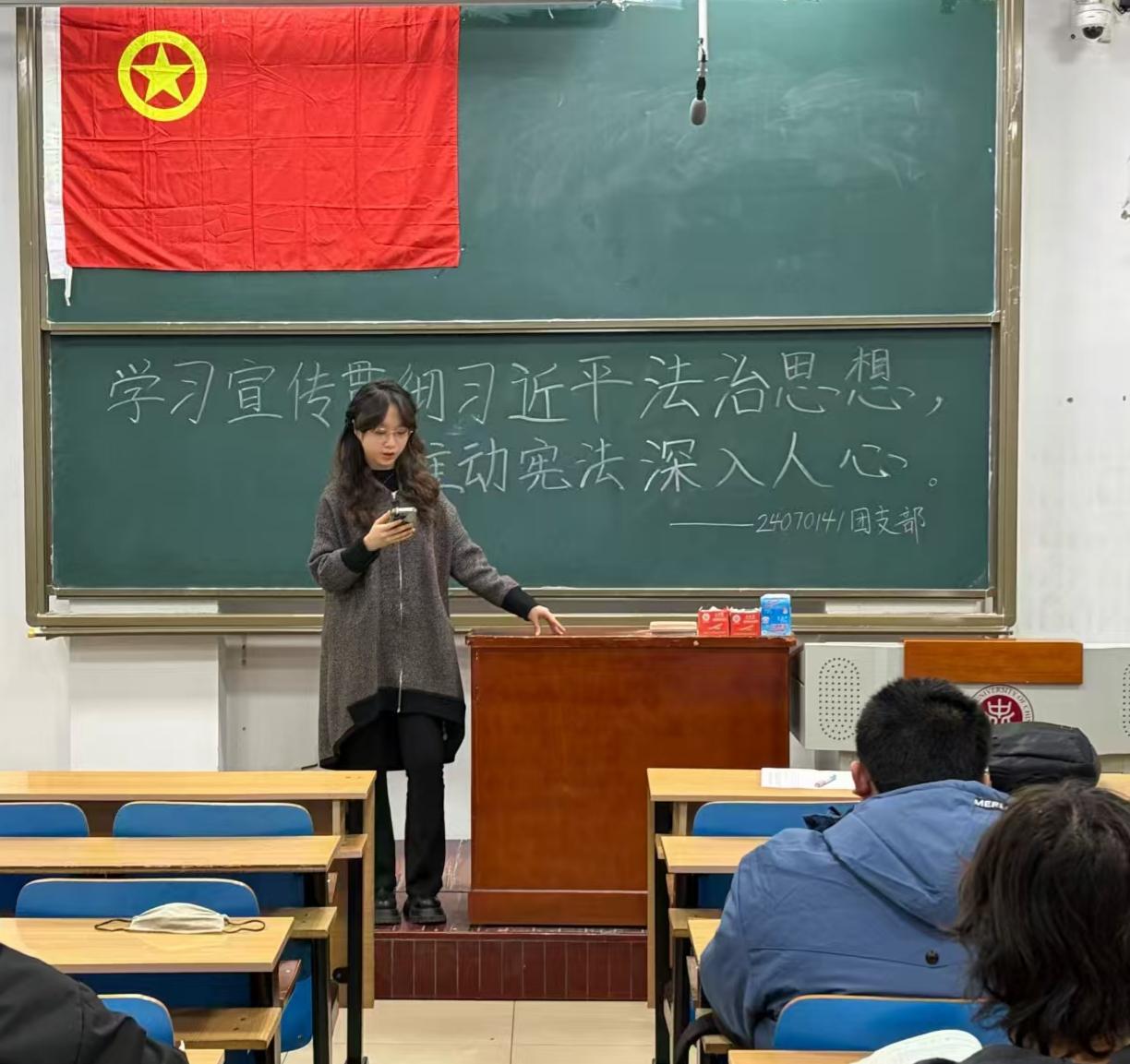 朔风渐起的冬夜,11406教室内却满是青春热忱。12月8日晚上七点,24070141团支部的同学们齐聚于此,一场以“学习宣传贯彻习近平法治思想,推动宪法深入人心”为主题的团日活动如约开启。在庄严的氛围中,同学们以青春之名赴法治之约,让宪法精神在校园落地生根。