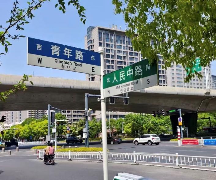 (图为盐城市青年路和人民中路路牌,多语言标示与国际接轨。胡涛 供图)