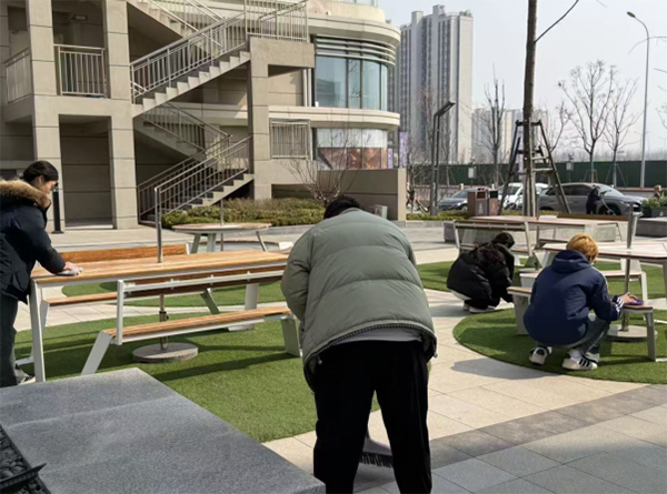 活动启动后,实践团成员迅速分组展开工作,手持扫帚、簸箕、抹布等清洁工具,对社区公园进行全面清扫。有成员负责玻璃幕墙清洁,另有成员负责社区宣传栏擦拭等,大家各司其职。成员们不怕脏不怕累,分组负责主路、小径等不同区域,配合默契完成路面清扫。随后,成员们又投入到公共设施维护工作中,用抹布仔细擦拭凉亭座椅、健身器材等设施,让这些设施焕然一新;还清理了公园内的垃圾桶,将垃圾分类装袋,运送至指定地点。