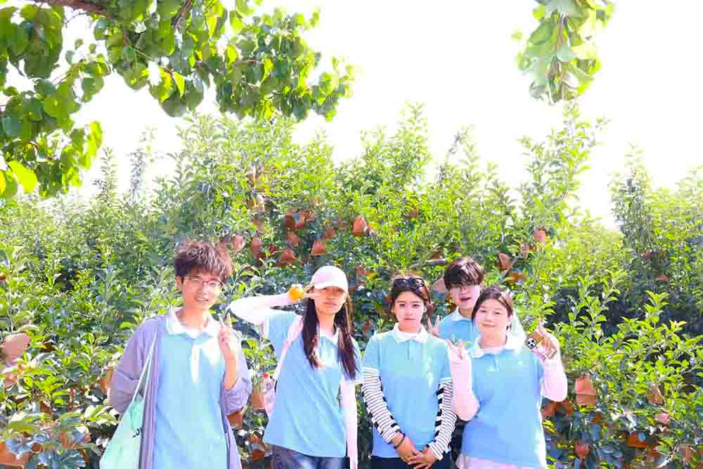 在栖霞市苹果种植示范基地技术人员的带领下,实践队分组展开实地调研。团队特别考察了博士达集团有机苹果范园,该园区采用宽行密植栽培模式,应用频振式杀虫灯、无公害生物农药等绿色防控技术,并创新性地引入"音乐培育法",通过播放舒缓音乐促进苹果生长,使果实糖度稳定在13度以上。此外,博士达集团还投资8000余万元建设深加工产业园,引进法国迈夫智能分选设备,实现苹果糖度、霉心病等指标的精准检测,年加工能力达1万吨,为栖霞苹果的高端化发展提供了重要支撑。