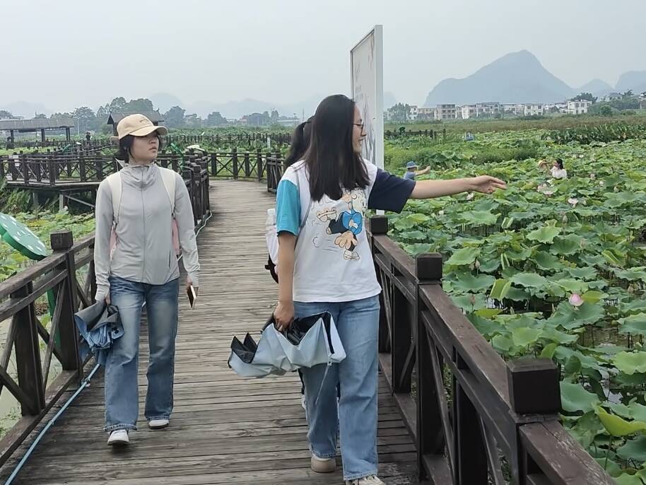 7月6日上午,调研队首先来到百朋荷苑景区。沿着荷花栈道前行,连片荷叶下藏着丰收的希望,队员们用镜头记录下这一景象。“这里水源充沛、土壤肥沃,难怪莲藕长得这么好。”队员小陈看着田间的优质环境感慨道。作为以荷莲文化为核心的景区,这里的自然条件为柳江莲藕的优质生长提供了坚实保障。队员们还与游客交流,了解他们对柳江莲藕的认知和消费意愿,同时热议西部陆海新通道带来的机遇,期待借助高效物流让莲藕更快走向国内外市场。