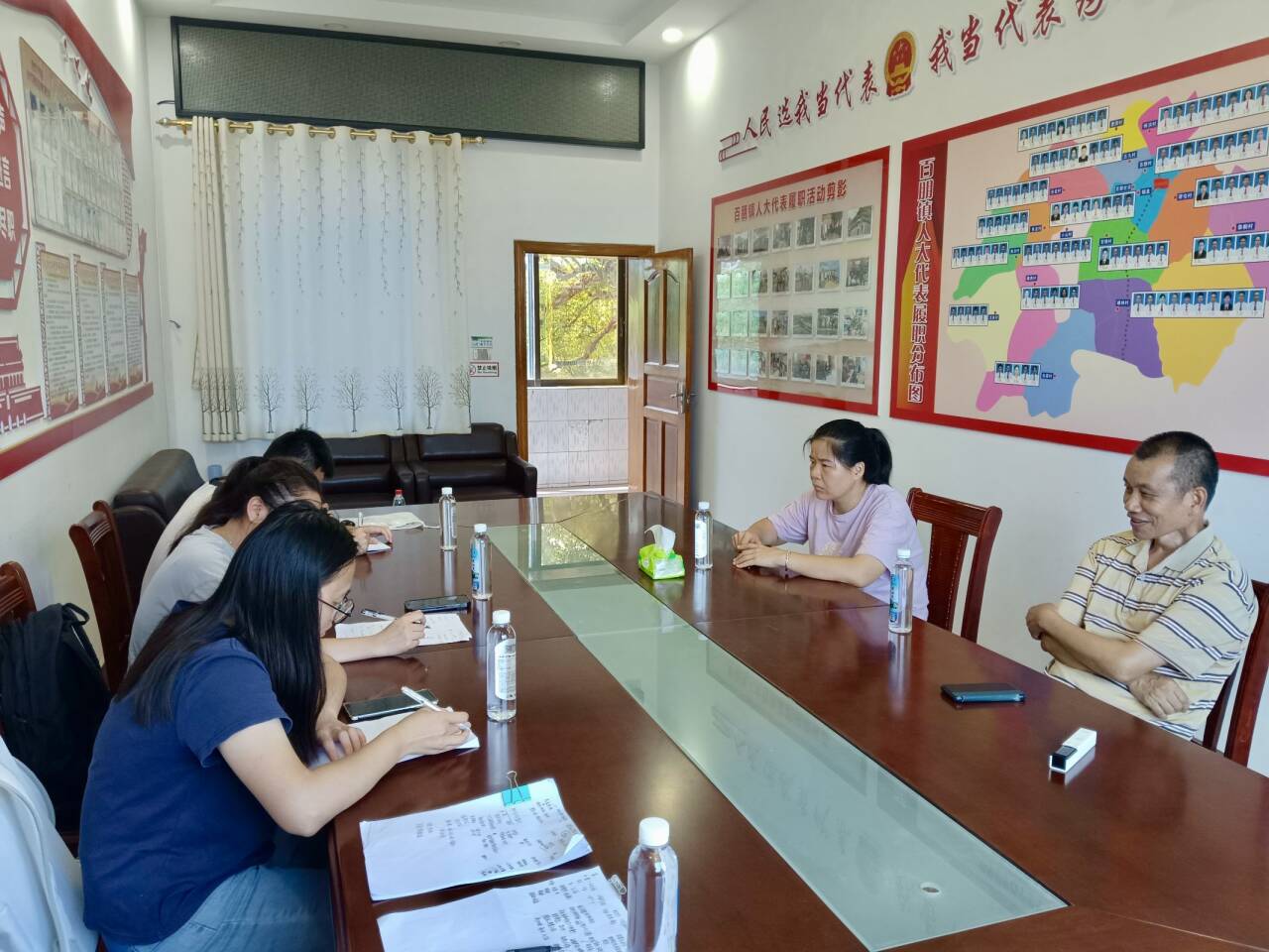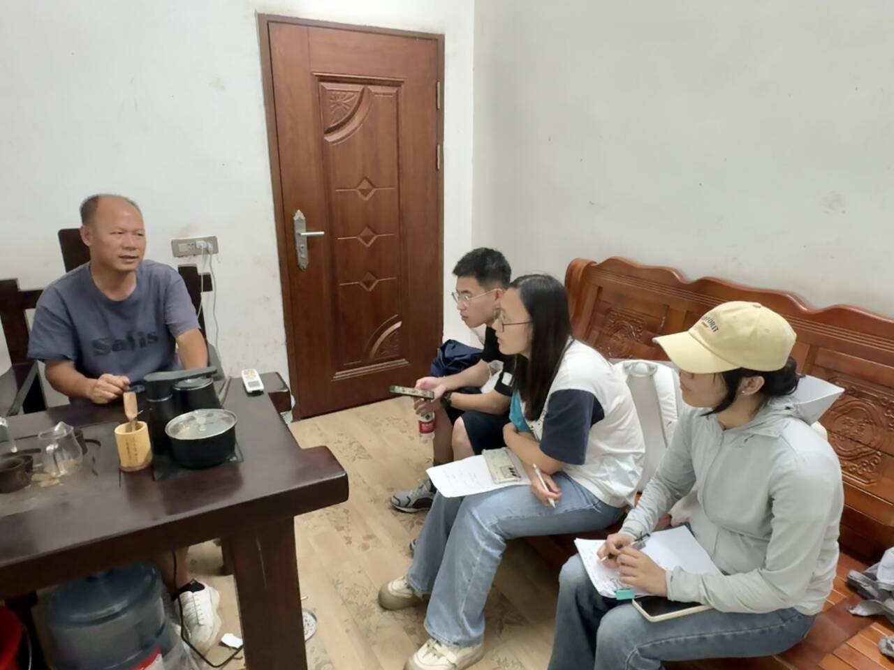图为团队成员与百朋镇人民政府农业服务中心覃主任及原百朋镇农技推广站蒙站长交流访谈,潘芝琳摄。