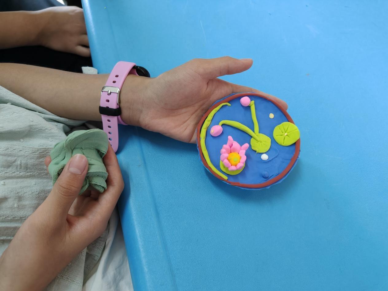 在创作环节,团队成员引导孩子们将脑海中的夏日元素用彩色粘土捏出来。孩子们表现出极高的专注度和创造力,安静而认真地投入到创作中。不一会儿,各种充满想象力的作品便纷纷诞生:有造型各异、清凉逼真的立体雪糕;有包含荷叶、荷花和小鱼的“迷你池塘”;还有小朋友别出心裁地将粘土作品粘在彩色卡纸上,组合成了一幅完整的夏日风景画。孩子们在创作过程中不断尝试新的造型和组合,展现出惊人的创造力和动手能力,也让团队成员们惊叹不已。