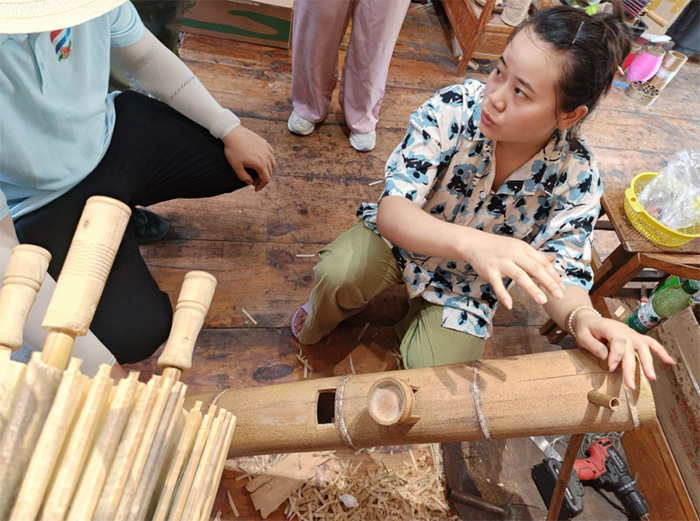 (图为罗钞妻子向团队讲解油纸伞制作过程 摄 董文辉)