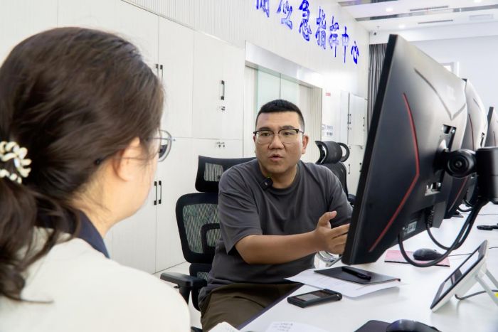图为省路网中心领导向实践队介绍青海省实时交通数据