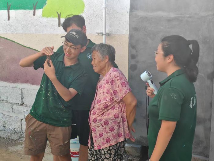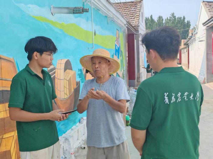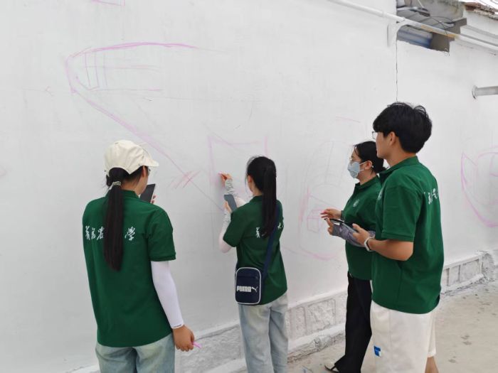 活动过程中,团队与当地党员、村民深度联动:走进党员王合平家中聆听历史回响,与村镇书记共同商议墙绘方案,向村民征求创作意见……从粉笔起稿、调色晕染到细节打磨,每一笔都凝聚着校地协作的心血。值得一提的是,队员们还向村民展示了墙绘AR技术,让静态画作与数字科技碰撞出奇妙火花,为传统文化传播注入现代活力。