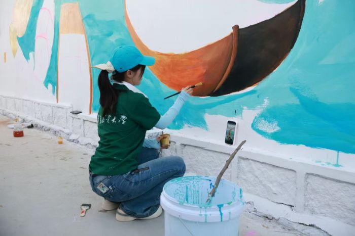 图为队员们进行墙绘填色工作。魏佳 供图