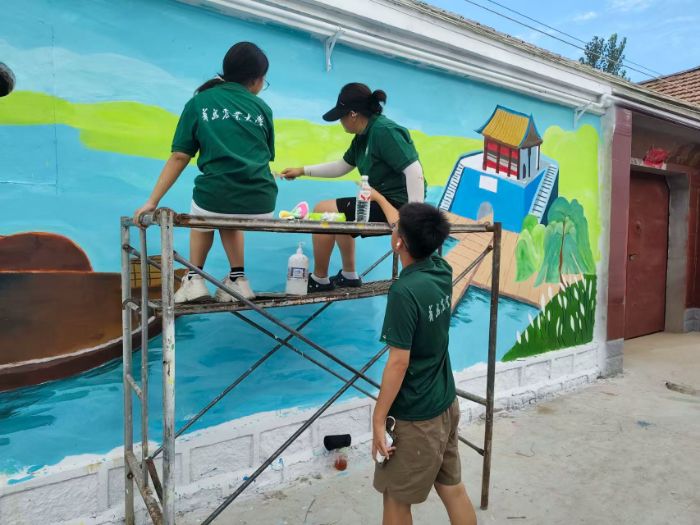 实践团首先扎根实地调研,深度挖掘四女寺镇特有的“四女奉亲 孝德文化与运河文化底蕴。在此基础上,团队成员化身“文化画师”,将传统元素融入乡村风貌设计,通过细腻笔触再现“四女奉亲”的孝德典故,以浓墨重彩描绘运河往昔商船往来的繁华盛景。在短短十天内,队员们高效完成了一系列精美墙绘作品,让沉睡的历史故事“跃”上墙面,将无形的文化遗产转化为乡村公共空间中可触可感的文化景观。