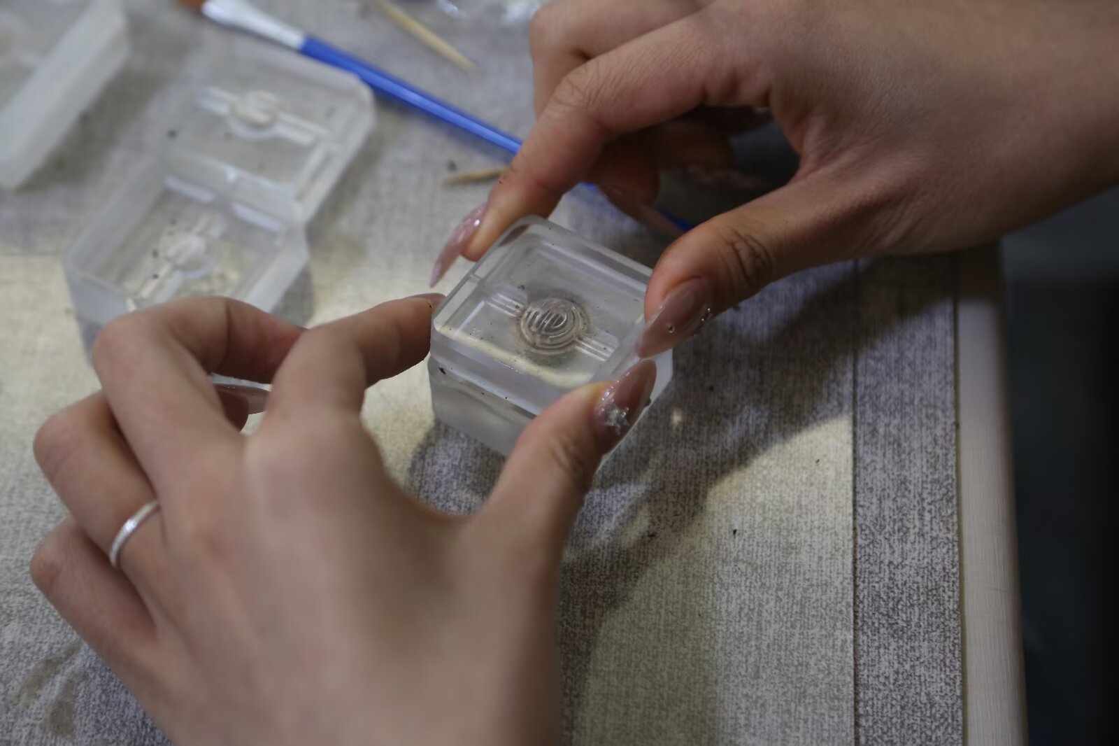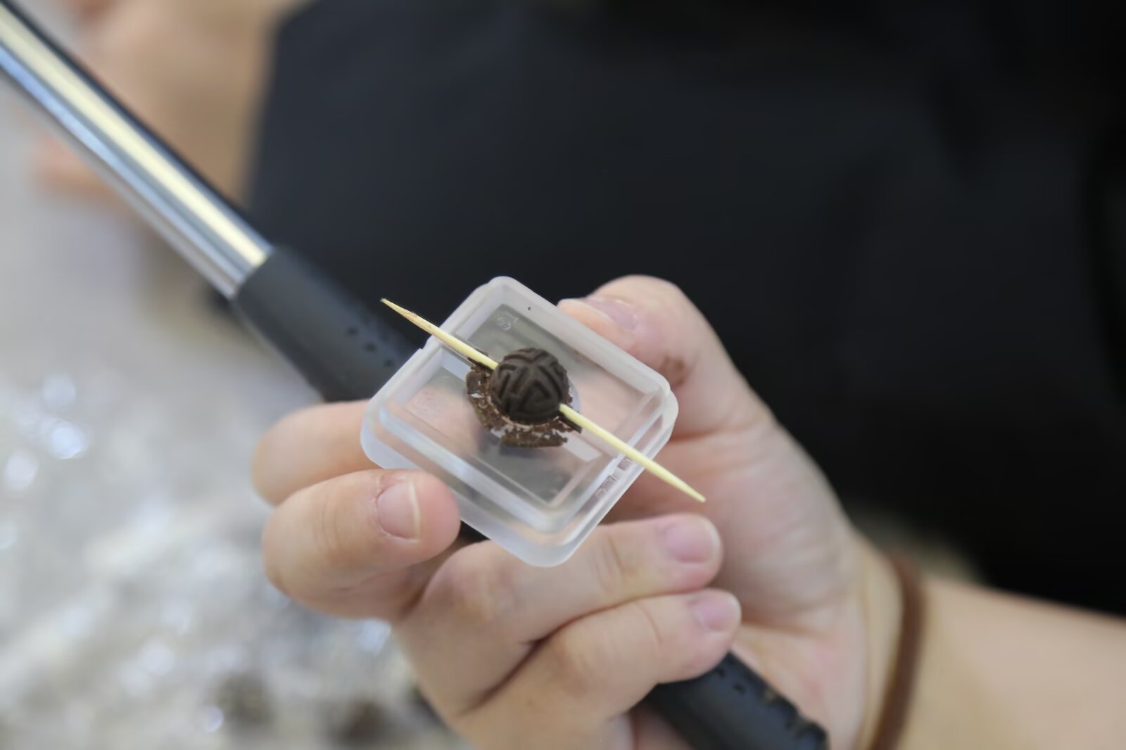 进入手工制作环节,同学们结合课堂上学到的食品胶体特性与配方优化知识,尝试调整香泥的湿度与韧性直至香粉形成“干湿均匀的絮状团”(无干粉、不滴水)。随后,将絮状香粉转移至硅胶垫进行揉合,在揉泥过程中,不少同学发现这与食品加工中面团揉制的面筋形成原理高度相似,于是借鉴揉面手法,让香泥更加细腻均匀,像揉面一样持续10-15分钟,直至香泥表面光滑、不粘手、有韧性(揉捻不到位会导致珠体开裂)。接着将揉好的香泥放入密封盒,常温静置20分钟(醒香),让纯露充分渗透香粉,使香泥质地更细腻,香气更柔和。醒香结束后,大家一边搓揉香泥、压制成型,一边交流创意,有的在香珠表面雕刻纹路,有的尝试混合不同香料探索新香气,现场充满了青春的创意与热情。