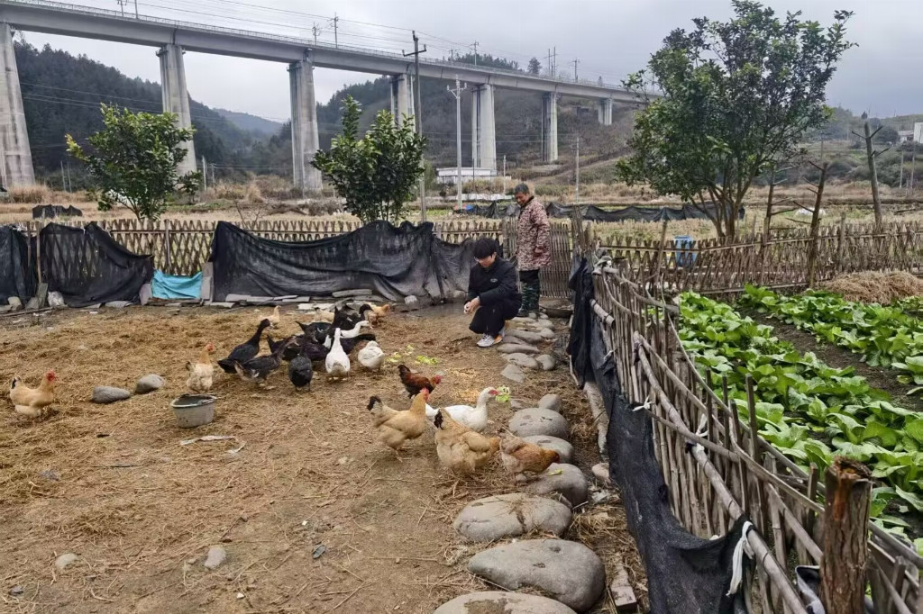 图为实践团成员在鸡圈喂鸡。黄一凡 供图