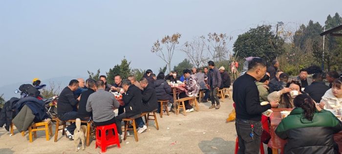调研期间,恰逢当地举办传统民俗活动“刨猪宴”,户主大叔主动邀请团队成员一同参与,让大家沉浸式体验乡村民俗的独特魅力。活动现场,村民们欢聚一堂,宰年猪、备佳肴、话家常,欢声笑语不绝于耳。团队成员主动融入其中,和村民们一起帮忙打理食材、摆放桌椅,品尝着地道的农家菜肴,感受着乡村邻里间的和睦温情。席间,调研团队采访到了大量关于白茶产业的细节,而户主大叔与村民的真诚与热情,也让团队成员深深动容。