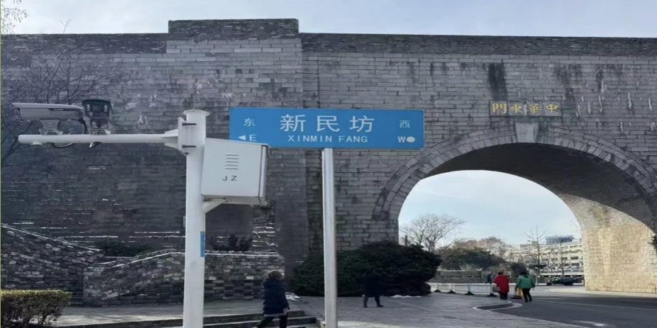(图为南京新民坊路牌,背景中的古城墙为其增添了文化底蕴。王泽锦供图)
