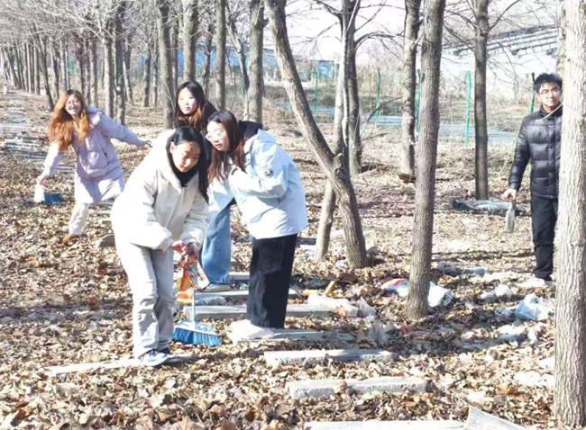 图为实践团成员侯汝冰、彭丽媛、李妍妍、韩瑞雪和刘振宇在打扫林中垃圾