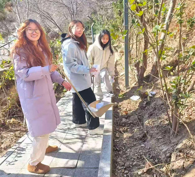 图为实践团成员侯汝冰、韩瑞雪和彭丽媛在打扫山区边角