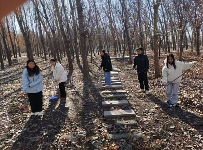 图为实践团成员韩瑞雪、张亦凡、李妍妍、刘振宇和彭丽媛在打扫林中街道落叶