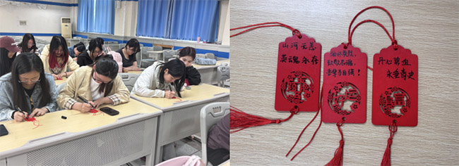 活动当日,校园内的桃树繁花满枝、春意盎然,粉白的桃花在春风中摇曳,为活动营造了庄重而温暖的氛围。学院团委提前为同学们准备了定制木质祈福签、笔墨、红绳等物资,一张张鲜红的祈福签上,镂空雕刻着“金榜题名”“好运”等充满青春朝气的纹样,既承载着同学们对未来的美好期许,也为缅怀英烈的庄重主题增添了青春温度。