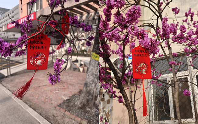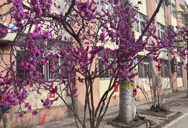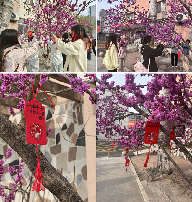 书写完成后,同学们小心翼翼地将祈福签系在桃树枝头,红绳轻绕,签语随风。满树鲜红的祈福签与粉白的桃花相映成趣,成为春日校园里一道动人的思政风景线。同学们驻足树下,轻声诵读签上的寄语,分享英烈故事,交流感悟体会,在潜移默化中接受爱国主义教育的洗礼,深刻感悟今日山河无恙的来之不易,坚定了传承英烈精神、践行青春使命的决心。